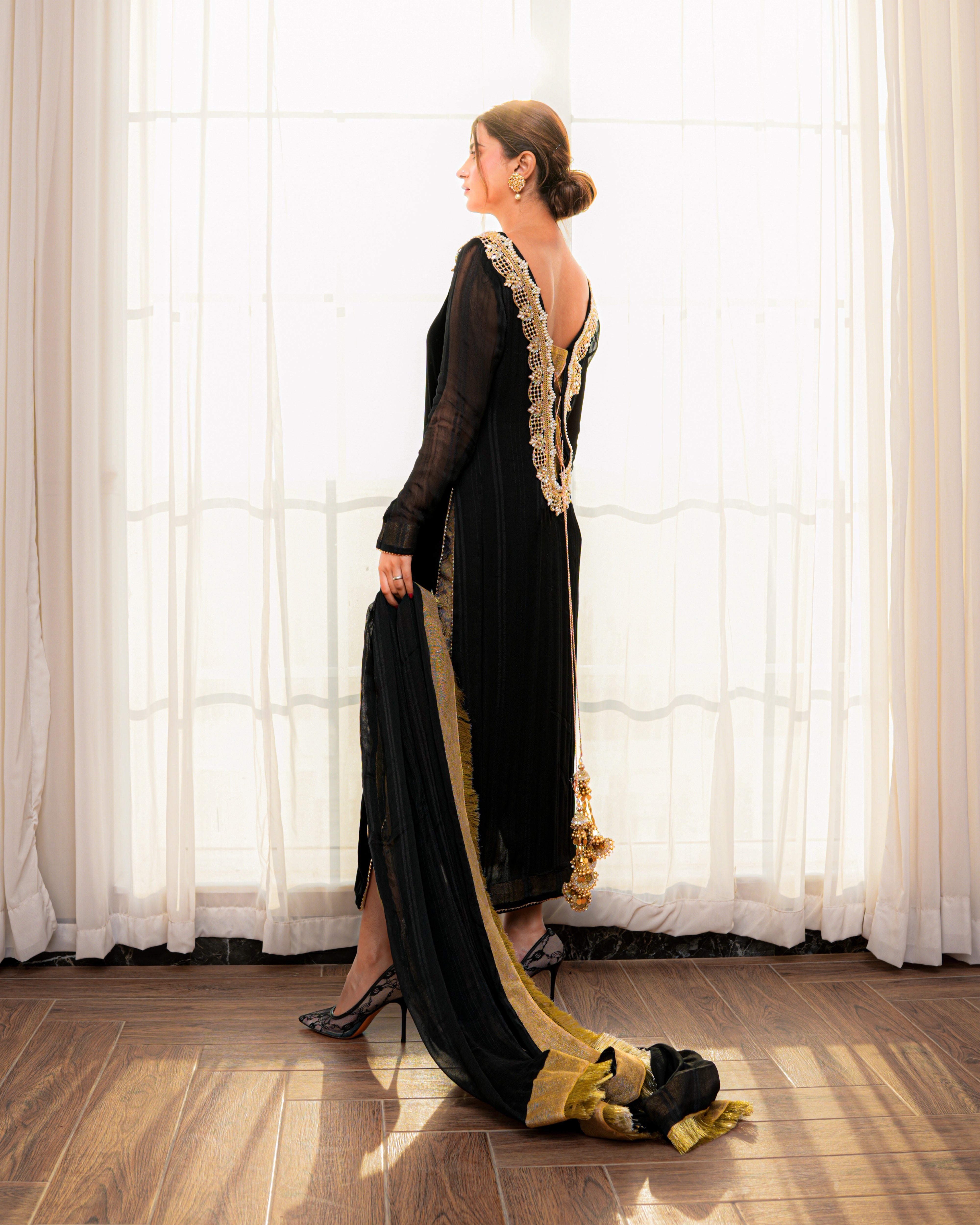 Delicate chiffon dupatta adorned with an intricate Fringe lace border, making it the perfect accessory to add beauty to any outfit with its refined detailing.