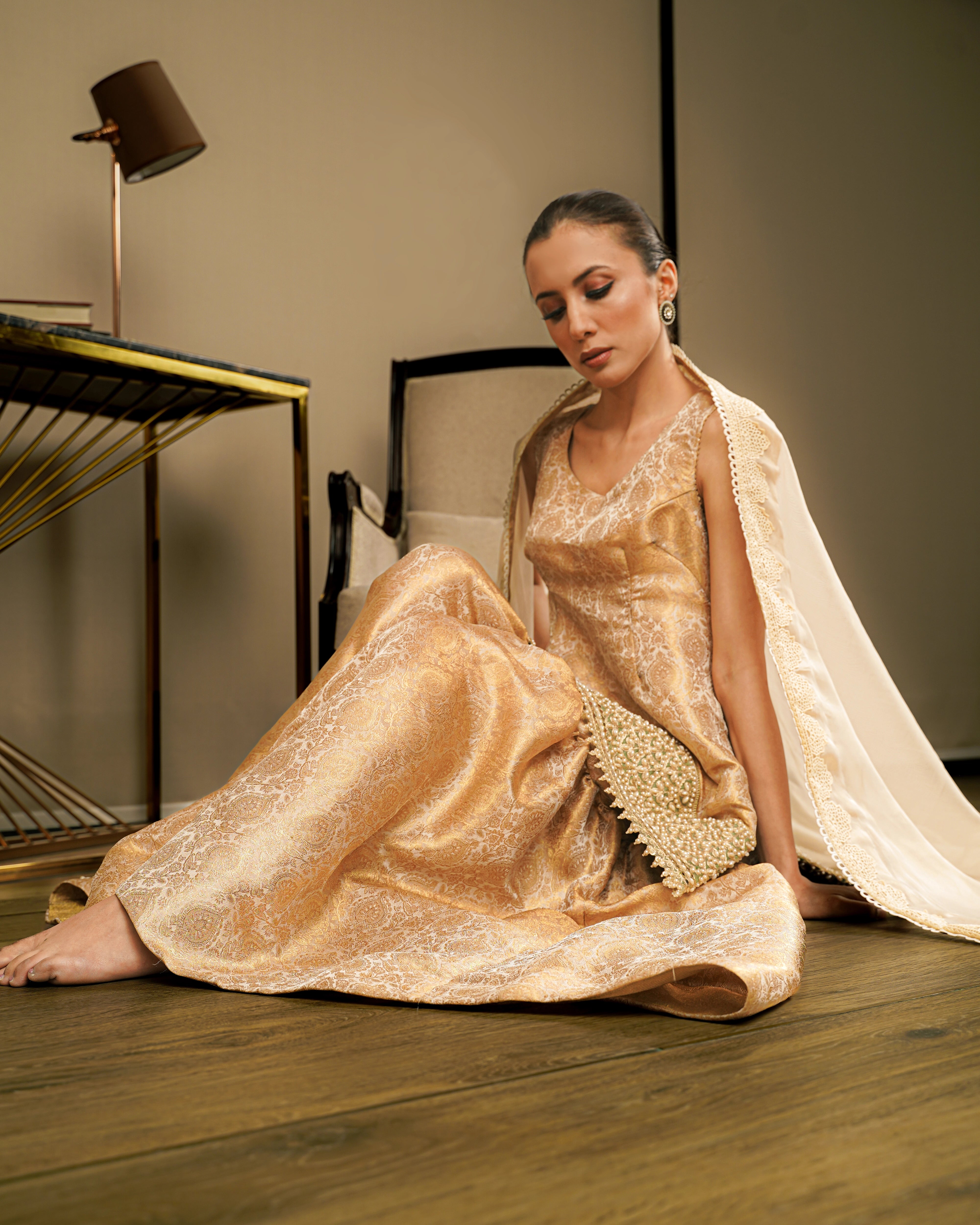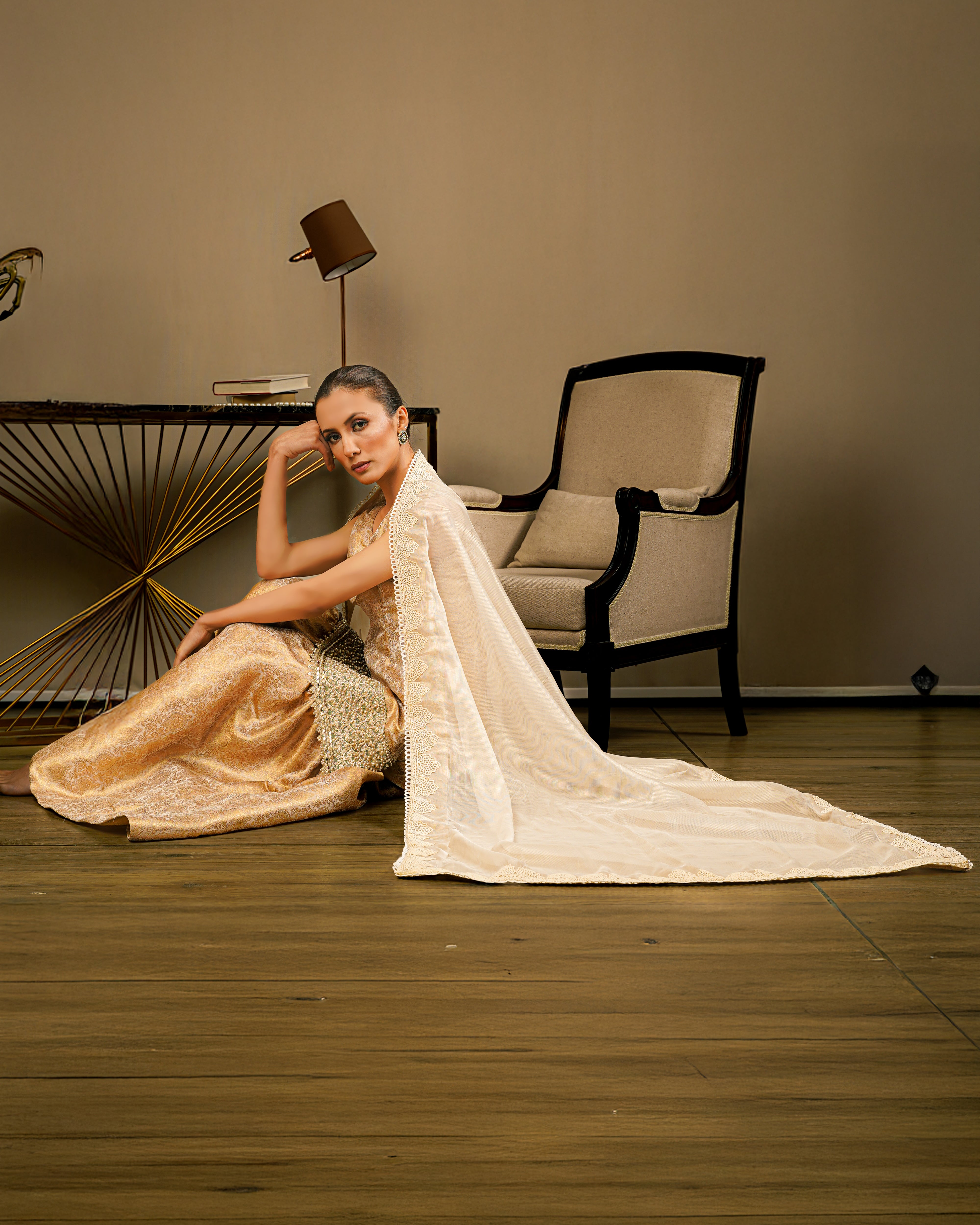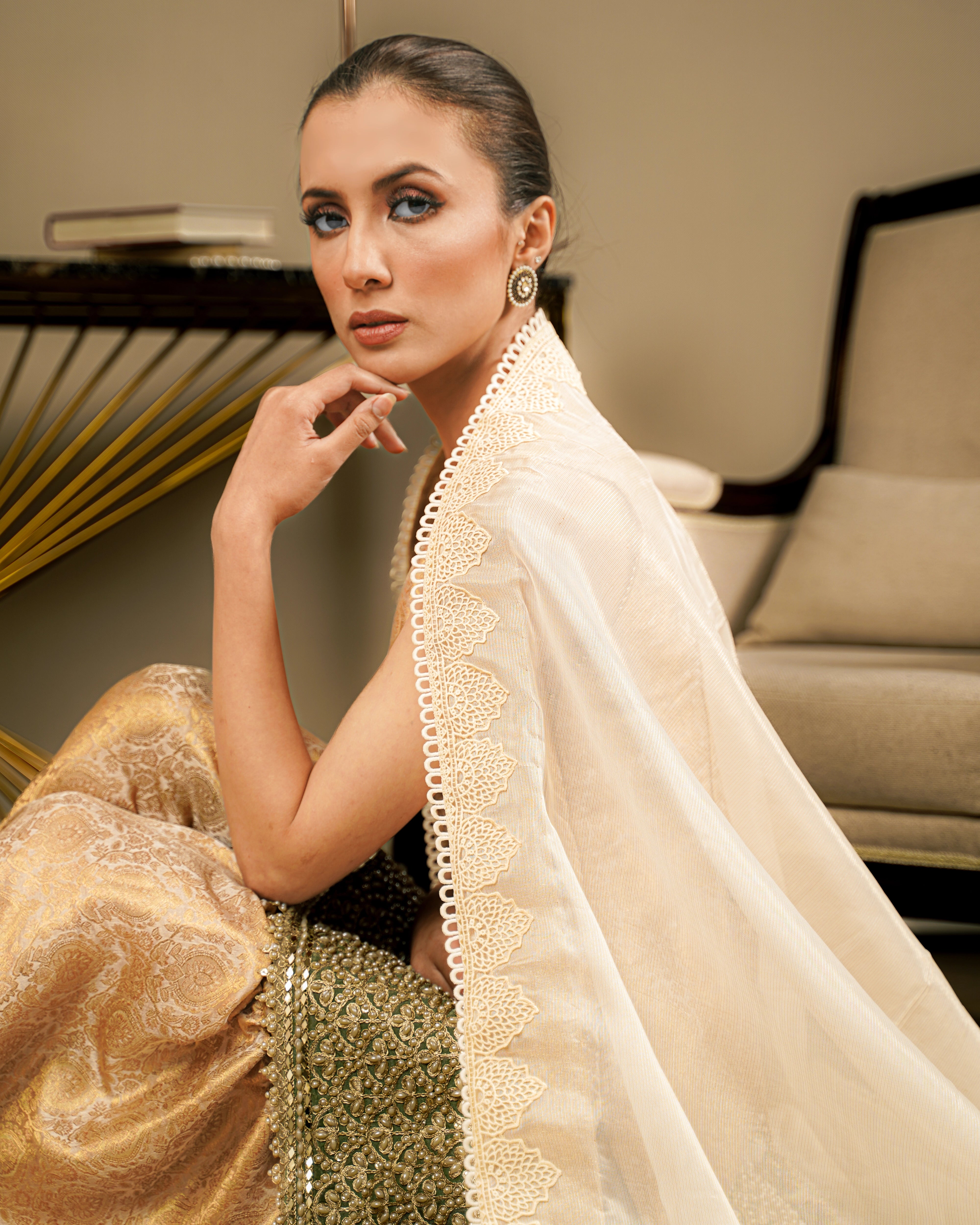 Delicate zari thread Masoori dupatta with Applique lace refined detailing and eternal charm for a graceful look.