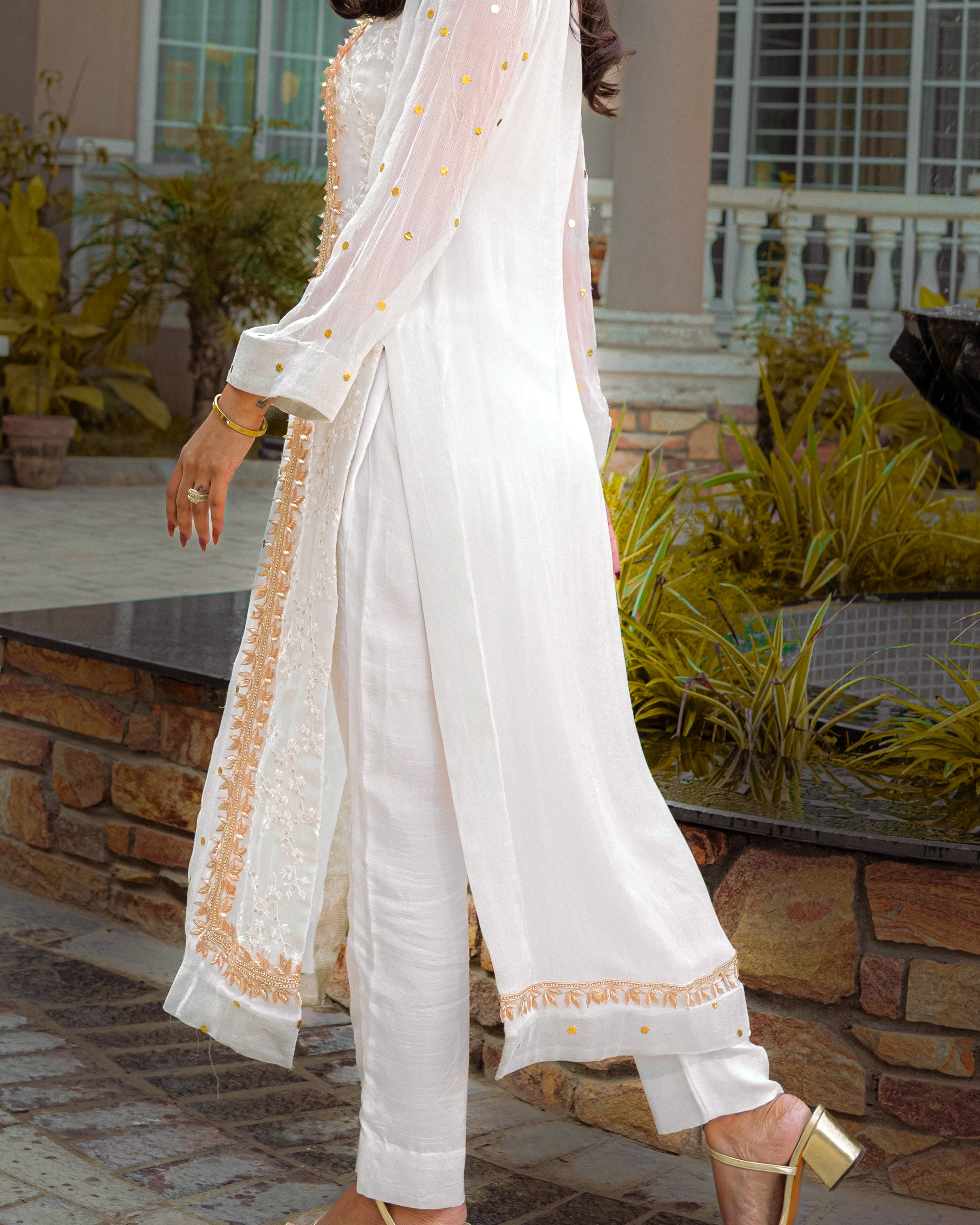 Exquisitely tailored cigarette pants made from luxurious raw silk give your outfit a sleek and sophisticated profile.